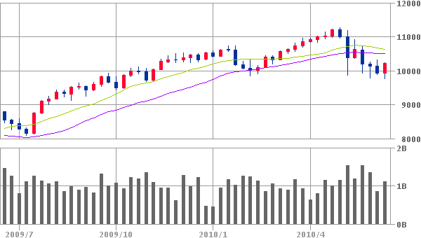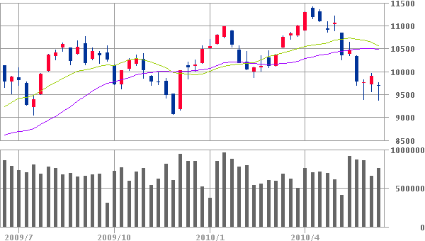 仰る通り日経は相変わらず¥10,000割れして久しく、低迷を続けておりまするが、週足を見るにこの辺で一旦は反発するかと見ておりまする。ただ、¥10,500を超えぬ限り、長期的な上昇は難しいように見ておりまする。暫し無理は禁物でござりましょうか(^^;