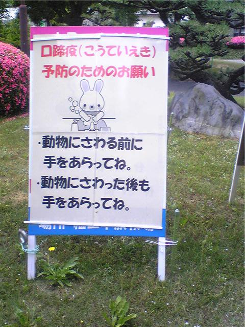 宮崎では口蹄疫が広がり心配されます。そんな中、各地では小動物とのふれあいが禁止されてきています。そんな中こんな看板が出されていました。ナゴヤコーチンの唯一の繁殖場所でこんなことで種が守れるのでしょうか?大変ご苦労されています。確かに網目で覆われ、小鳥も近づけません。しかし人間が・・・豊橋のウズラ事件があってまだ日が浅いですが心配です。豊橋も宮崎も参考にしているんでしょうね。