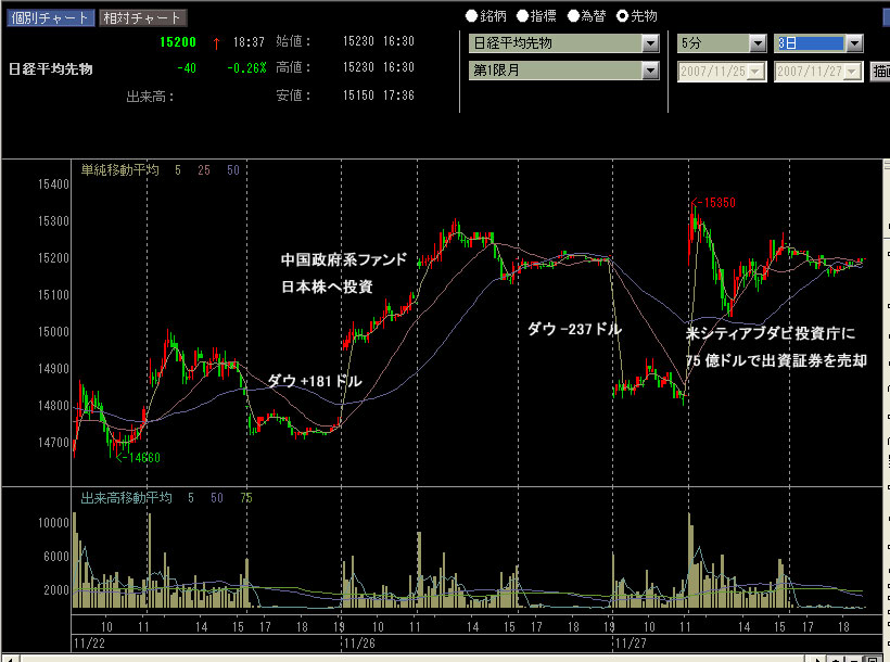 ∇日本市場は続伸。前場は、NY市場の大幅安と円高進行を受けて、日経平均-300円くらいで推移しました。昼休みに、「米シティ、アブダビ投資庁に75億ドルで出資証券を売却」とのニュースが伝わり、一気にアジア株が戻り円安も進みました。後場寄りは、日経平均先物で380円のギャップアップ。MUFGは、後場寄ったのは12:57とめちゃくちゃな値動き。後場は日経平均先物の板が薄くてボラが高くなり不安定な感じでした。業種で強かったのは、金融、値嵩ハイテクあたり。鉄とか商社とかは相変わらず弱かったです。