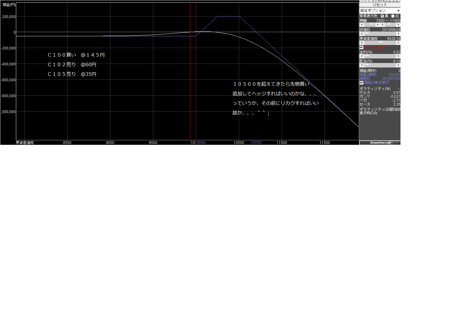 先々月プットデビのときは、現在価格からあっと言うまに500円下がって簡単にINしたのに、コールは1万250まではいくけど、そこから上が重い、、、><