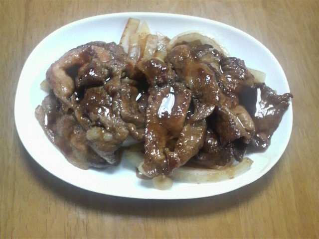 今週の料理は、毎度お馴染みのしょうが焼き。今回は玉ねぎとエリンギを炒めて合わせて見ました。毎週こってり料理ばかりで申し訳ありませぬ(^^;