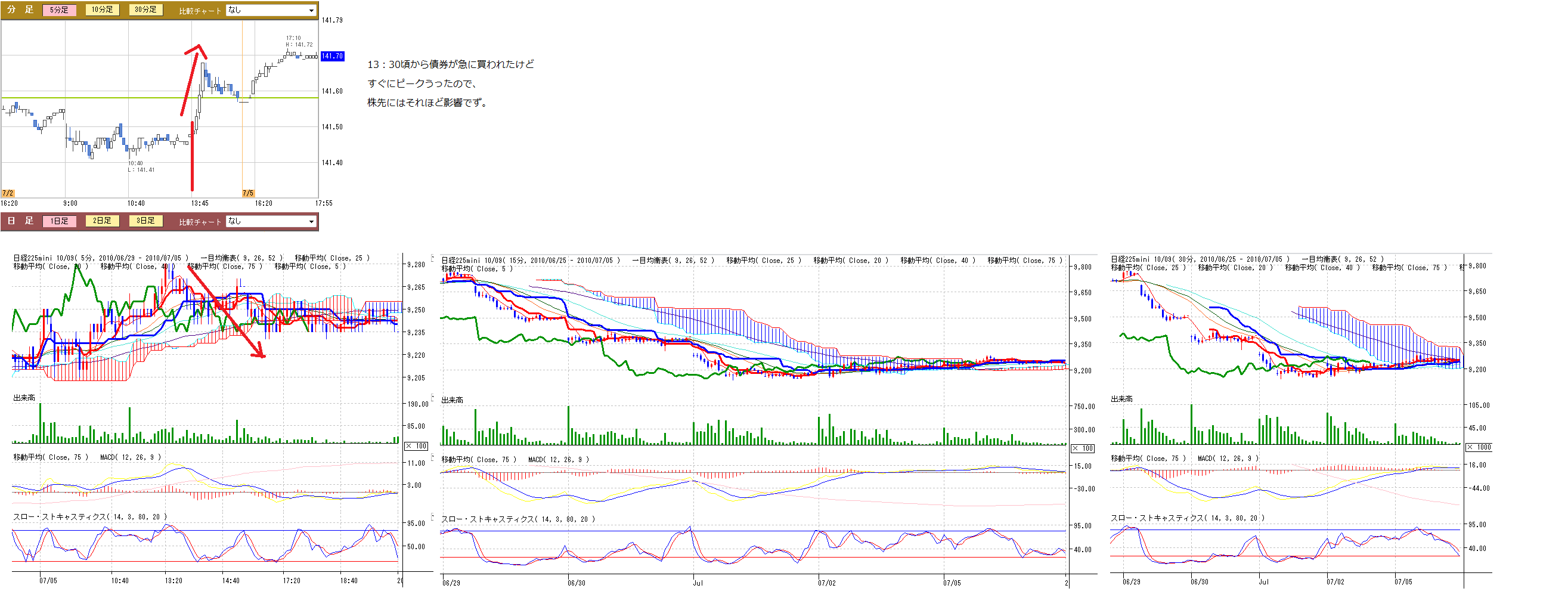 13:30すぎから債券急騰、株先売り、