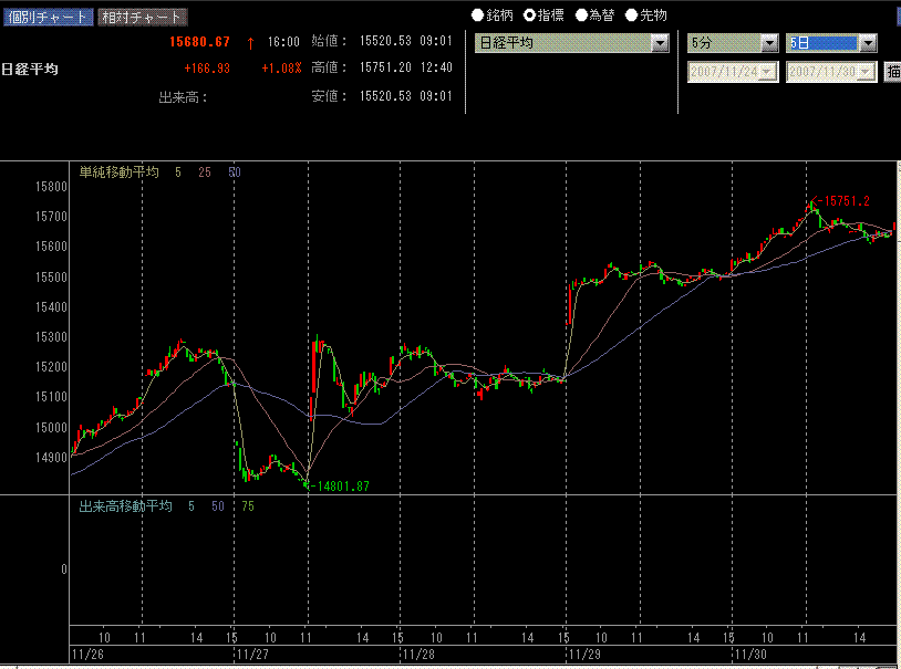 ∇日本市場は続伸。朝方、バーナンキFRB議長の講演が伝わり、前日のコーンFRB副議長の講演と同様に追加利下げを示唆するものだったことからGLOBEXの米株価指数先物が高くなり、日本市場も買いが優勢になりました。ドレッシング買いもあったでしょうけど、指数は底堅く、これまで動きが鈍かった商社、海運、鉄、非鉄などにも買いが入り、全体の出来高も増えてきました。あまりに綺麗に相場が好転した感じもしますが、心配しすぎかな。しかしまあ、去年とほぼ同じタイミングで反発するとは・・・。