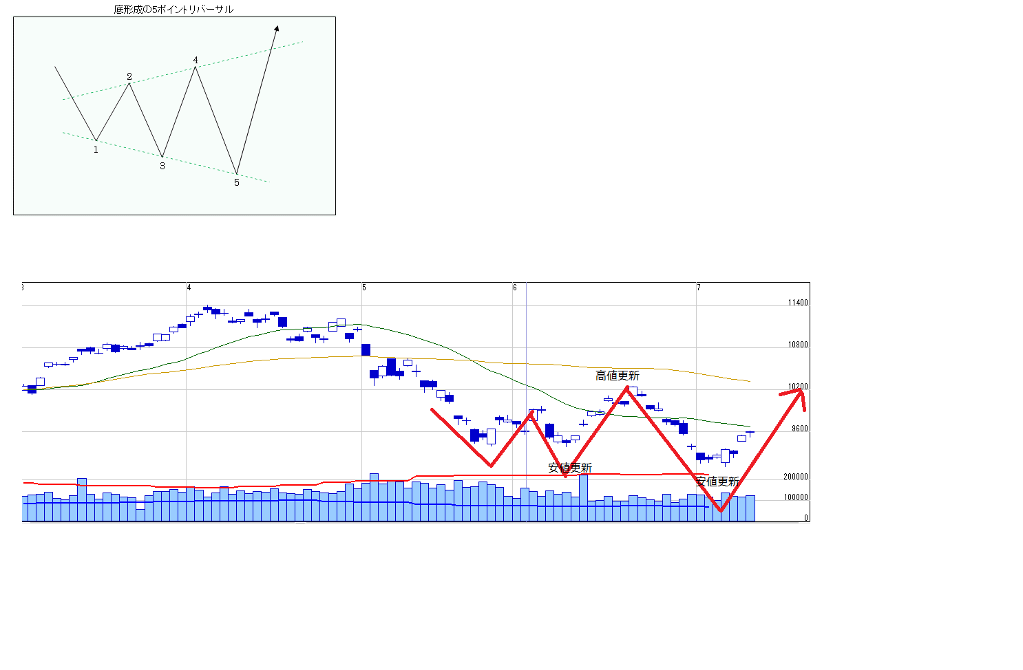 先ほど紹介したブロードニングフォーメーションですが、日経の形がまさにこのロルッソーの5ポイントリバーサルに似てる!!(画像1)