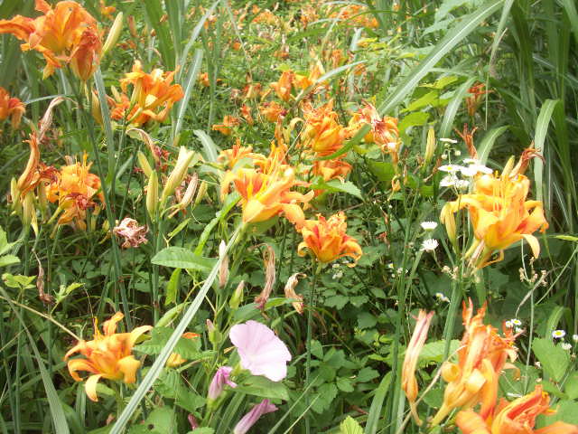 写真1:咲き始めたヤブカンゾウの群落、ヒルガオも咲いてます