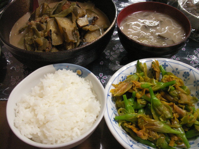 写真2:煮物(太いキュウリと身欠きニシンの旨煮)、ナスビとそうめんの味噌汁、ヤブカンゾウのおひたし、その他