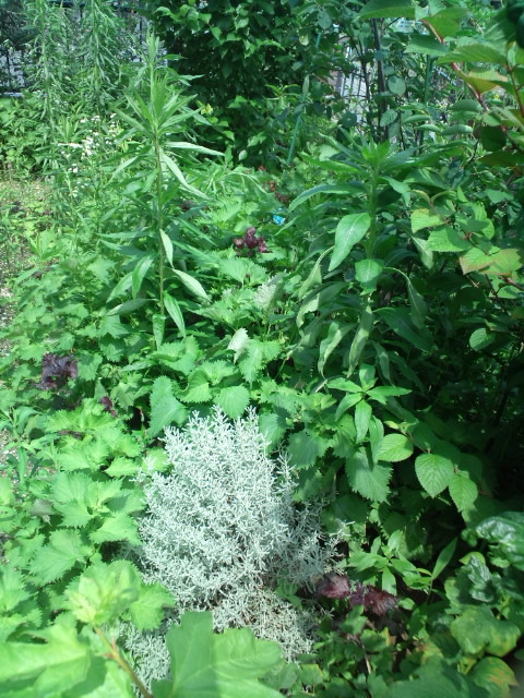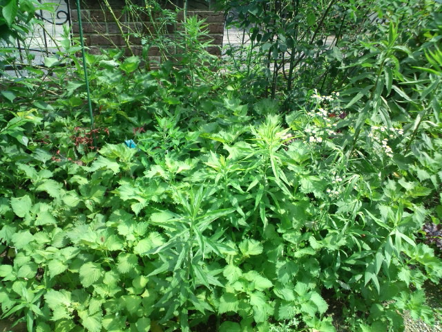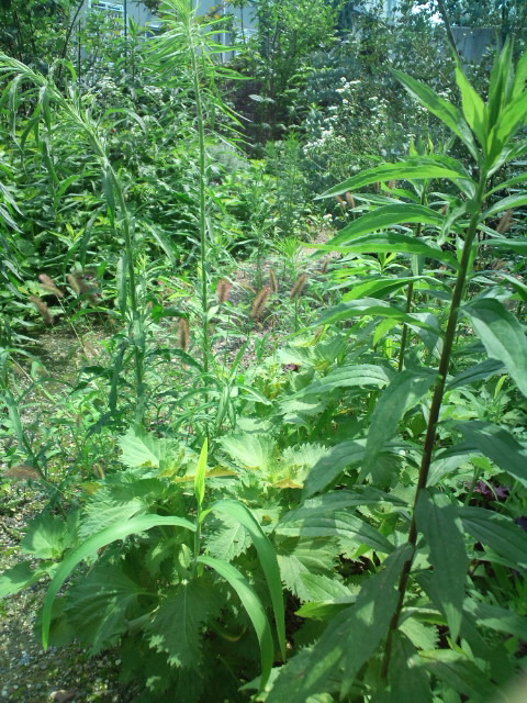 写真をよく見るとおわかりになるかもしれませんが、草だけでなく、去年植えた青ジソから種がこぼれて、青ジソもジャングル状態に生えていました。