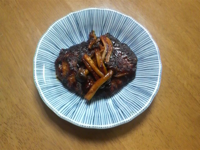 しめじも一緒に秘伝たれで照り焼きにして出来上がり。見た目よりはさっぱりと頂けるかと存じまする。