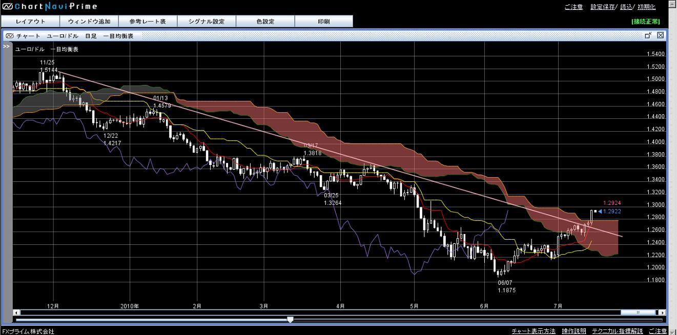 チャートも上値抵抗線を越えたし、一目の雲も上抜け。本当に1.3100かも。今日の夜は米国消費者物価指数とミシガン大学消費者景況感指数がある。これも弱ければ1.30台か!と調子に乗るのは止めて、欲張らず一部は利食っておこうかなと思ってます。(因みにFXプライムの井戸端会議のポイントガードさんも1.3100がターゲットと書いている。心強い♪)