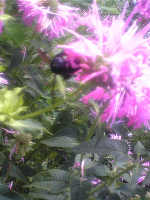 リアトリスとクマバチ、リアトリスにはみつばちや蝶も来ますが、ここではクマバチに人気のようです。こうやって、近づいても絶対に襲われません。むやみに動かないからでしょう。