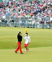 ホールアウトし観衆の声援に帽子を取って応える石川(撮影・下田雄一)<米男子ゴルフ:全英オープン>◇最終日◇18日◇英・セントアンドルーズ・オールドコース(7305ヤード、パー72)