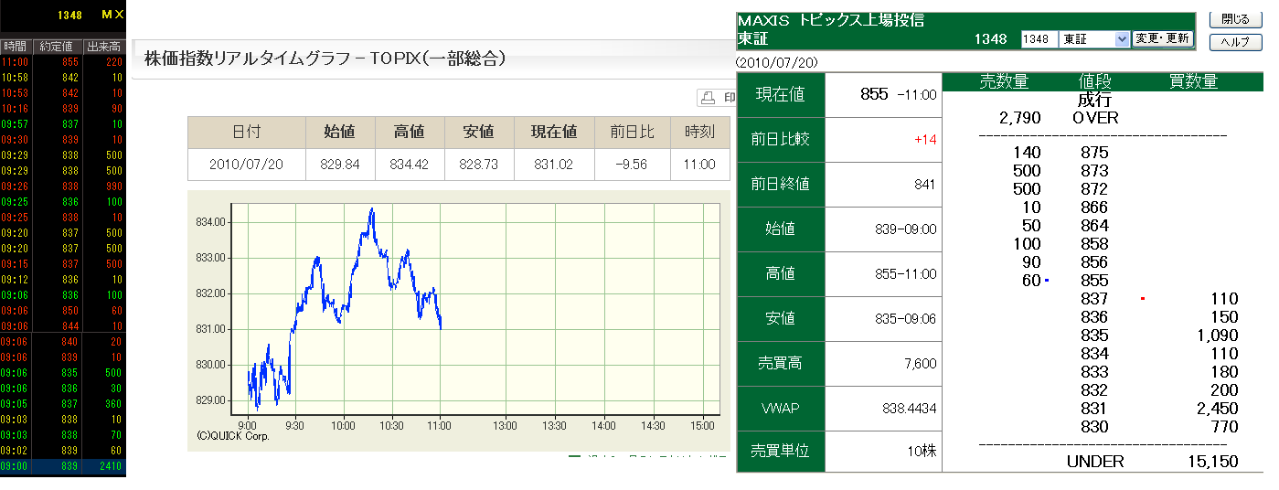 前場の約定値とTOPIXと前引の板はご覧のとおり。約定値が高すぎます。