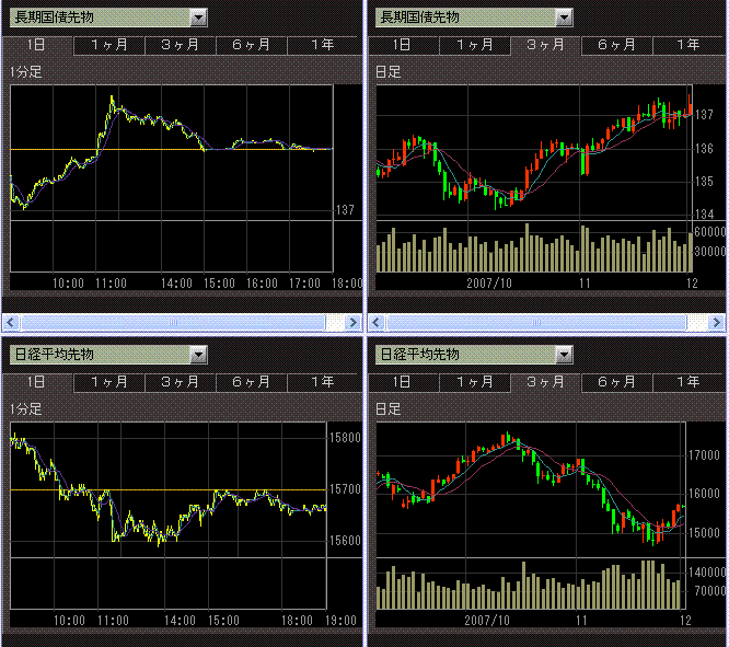 ∇日本市場はまちまち。日経平均は小幅安、TOPIXは小幅高。ほぼ寄り天で上値が買われなかったのと、福井日銀総裁の利上げに対して慎重と取れる発言で、JGB先物買い・株先物売りの仕掛けが入りました。