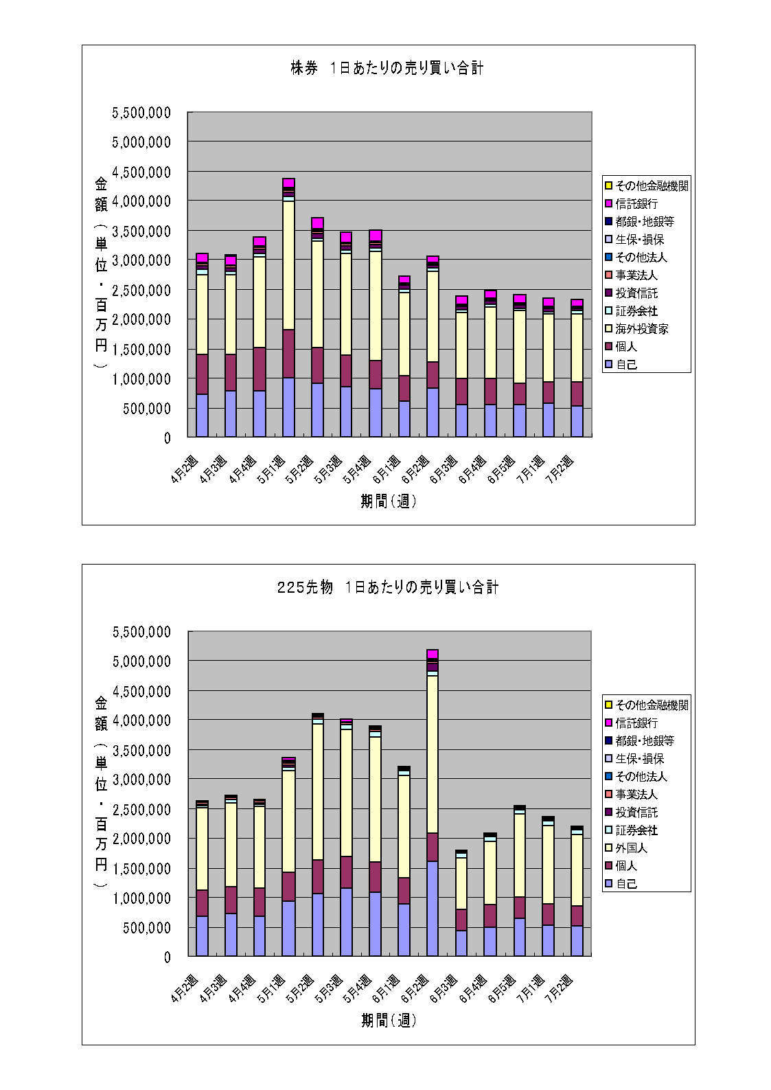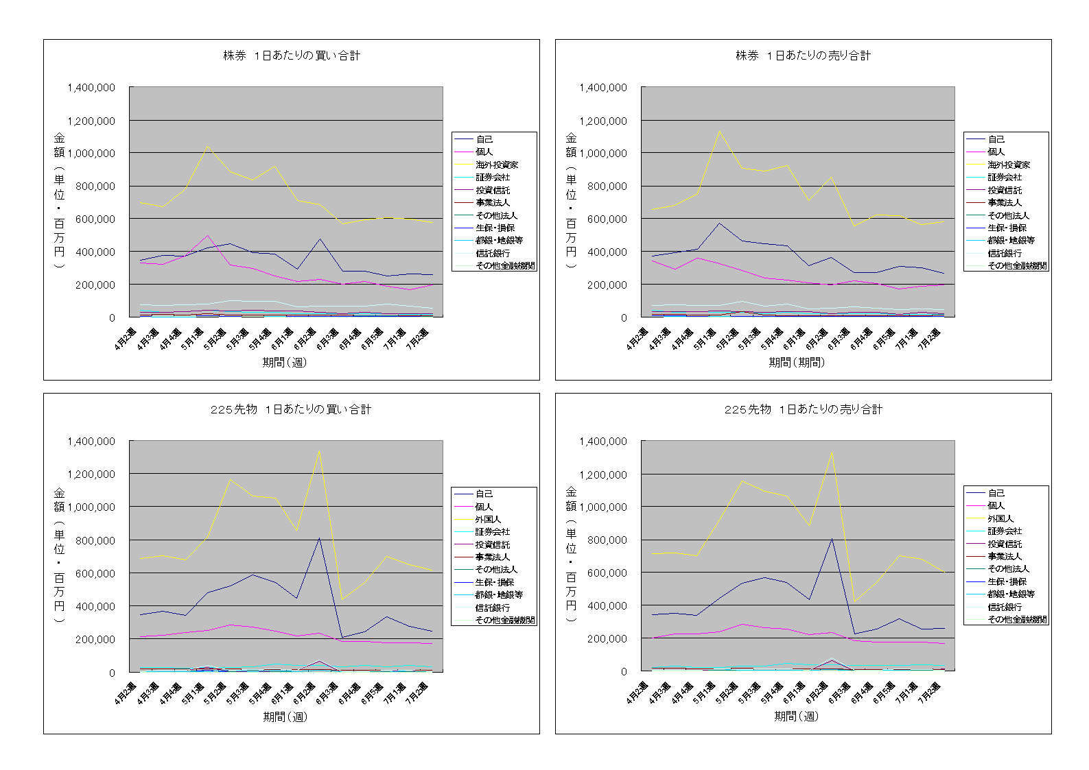 株券の出来高は低水準での安定、225先物の出来高は6月MSQ週の突出分をうまく均すと5月2週の出来高をピークに約半減まで緩やかな下降線といったところでしょうか。