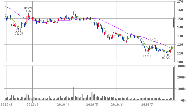 売買停止時間を過ぎても寄り付かず、10時近かった頃140円で寄り付いて、いきなり26週線138円を超えたので、52週線の171円も視野に入ったと思い見ていたが、前場は149円で引けた。