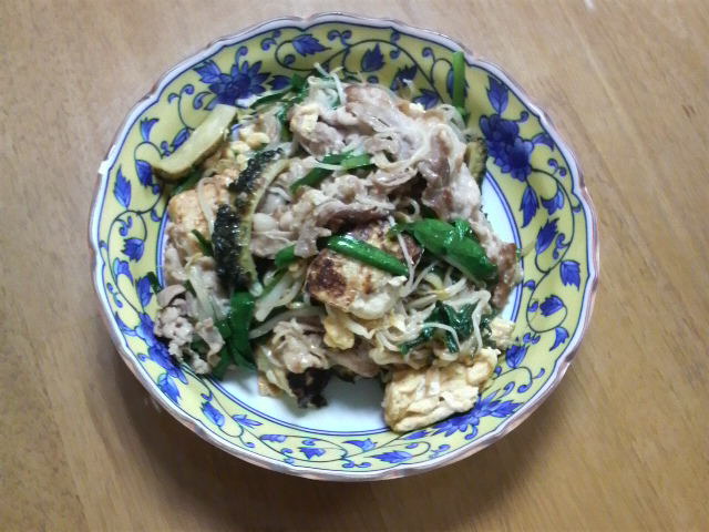 続いて、豚バラ肉、電子レンジで加熱し水気をよく切った豆腐をフライパンで炒め始め、豆腐に焦げ目がついてきたら、もやし、ニラ、ソーメン(半分に折り茹でておく)、とき卵(手間を惜しまずば、塩、粉末だしで下味をつけてとろふわ程度に先に焼いておく)の順に炒めていき、ゴーヤを混ぜ、塩、こしょう、鶏がらスープの素で味を整えて下さりませ。