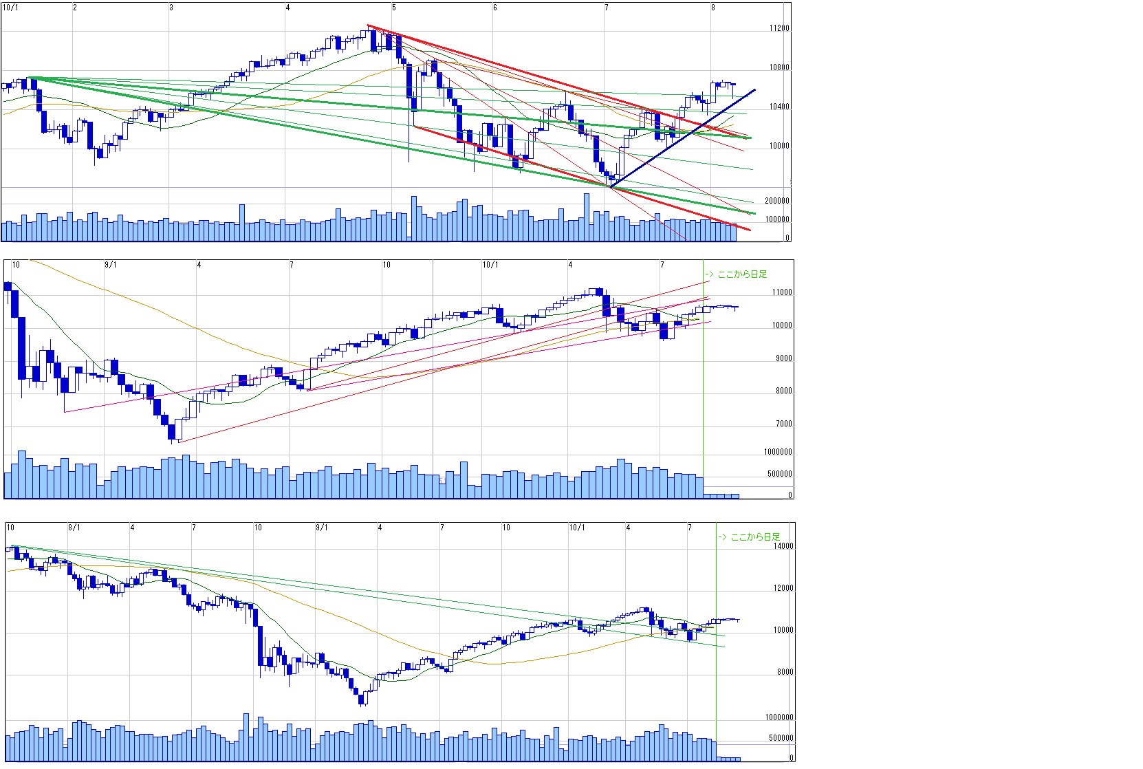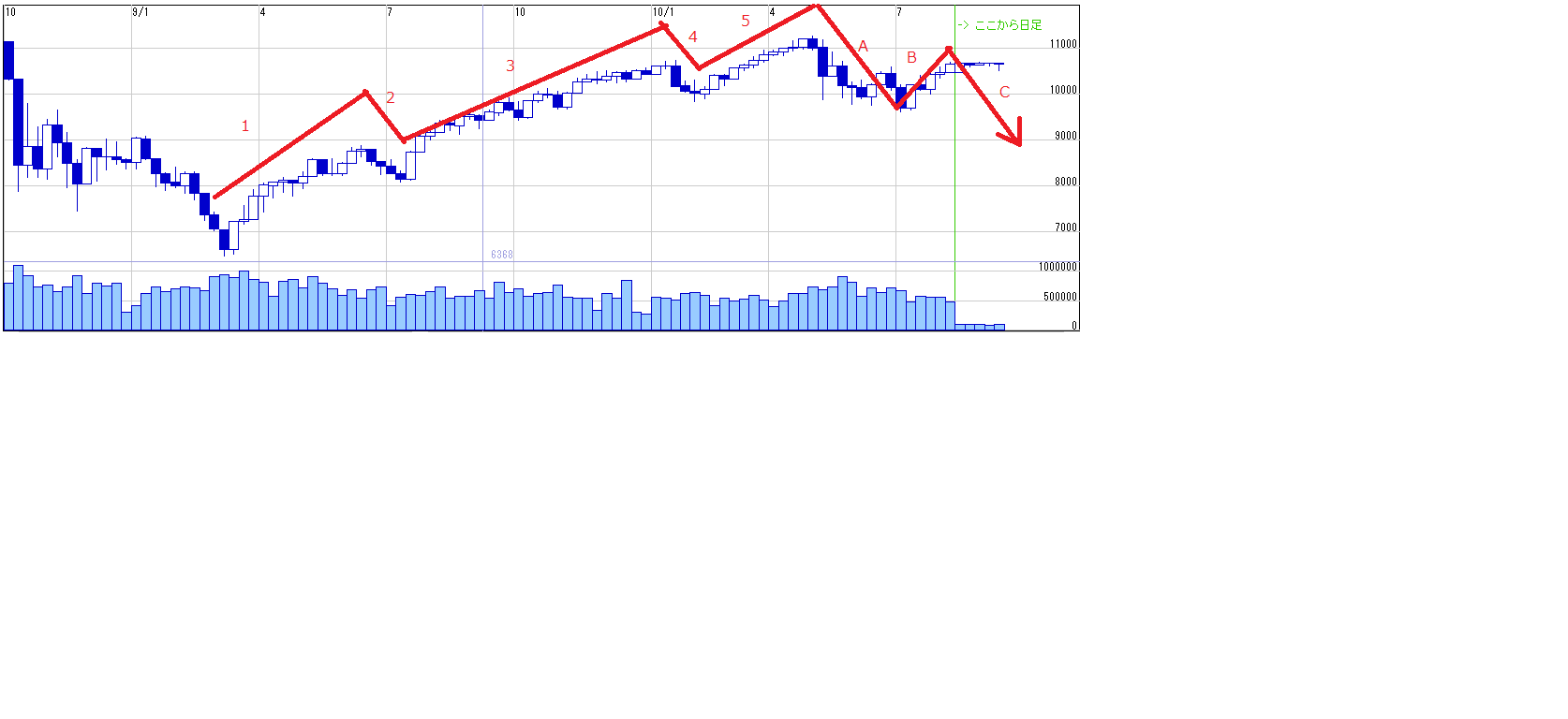61.8戻し(10630)達成で戻りB波が終わり、下落C波に入ると予想。