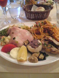 ワンプレートで前菜盛合わせ、パスタ、メインのコースを。