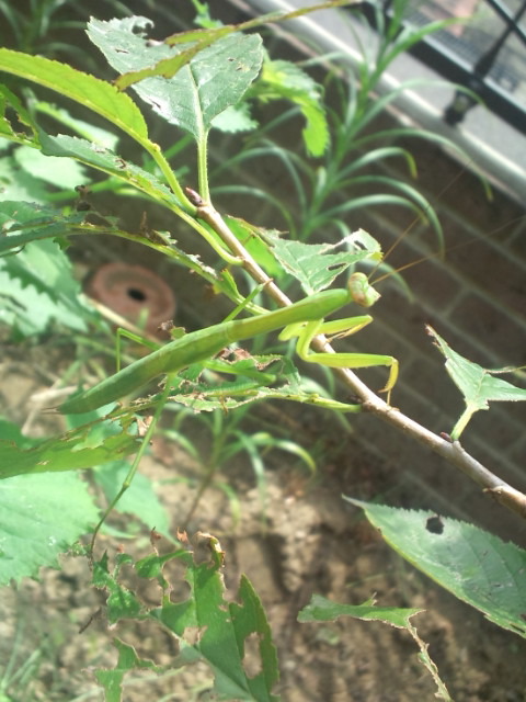 これだけバッタがいればカマキリもいるのではないかと探してみると、やはりカマキリも別の葉っぱの上にいました。