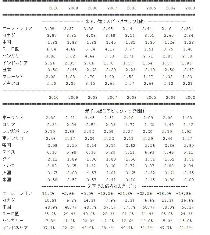 つぎに、ビッグマック指数から考えてみる。 2010年1月におけるビッグマック指数は別表の通りだ 日本のビッグマックはドルベース価格=3.5ドルだったがアメリカ本国でも3.58ドルとほぼ同じ価格である。この時の為替レートは1ドル=92円前後である。 ビッグマックの価格には人件費、厨房機器、店舗の内装、不動産賃貸価格が織り込まれておりさらに包装材や店舗備品、光熱費、水道料金、輸送費用といった生活に必要なコストは殆ど織り込まれている。そう考えるとなんか1ドル=79円はちょっと実態からかけ離れているようにも思える。