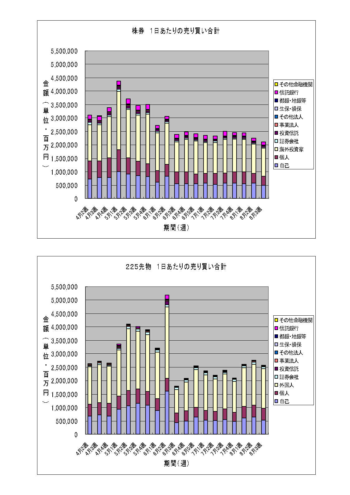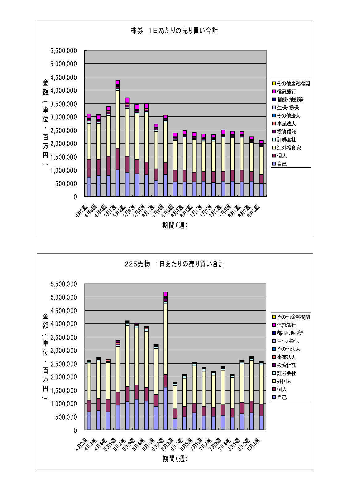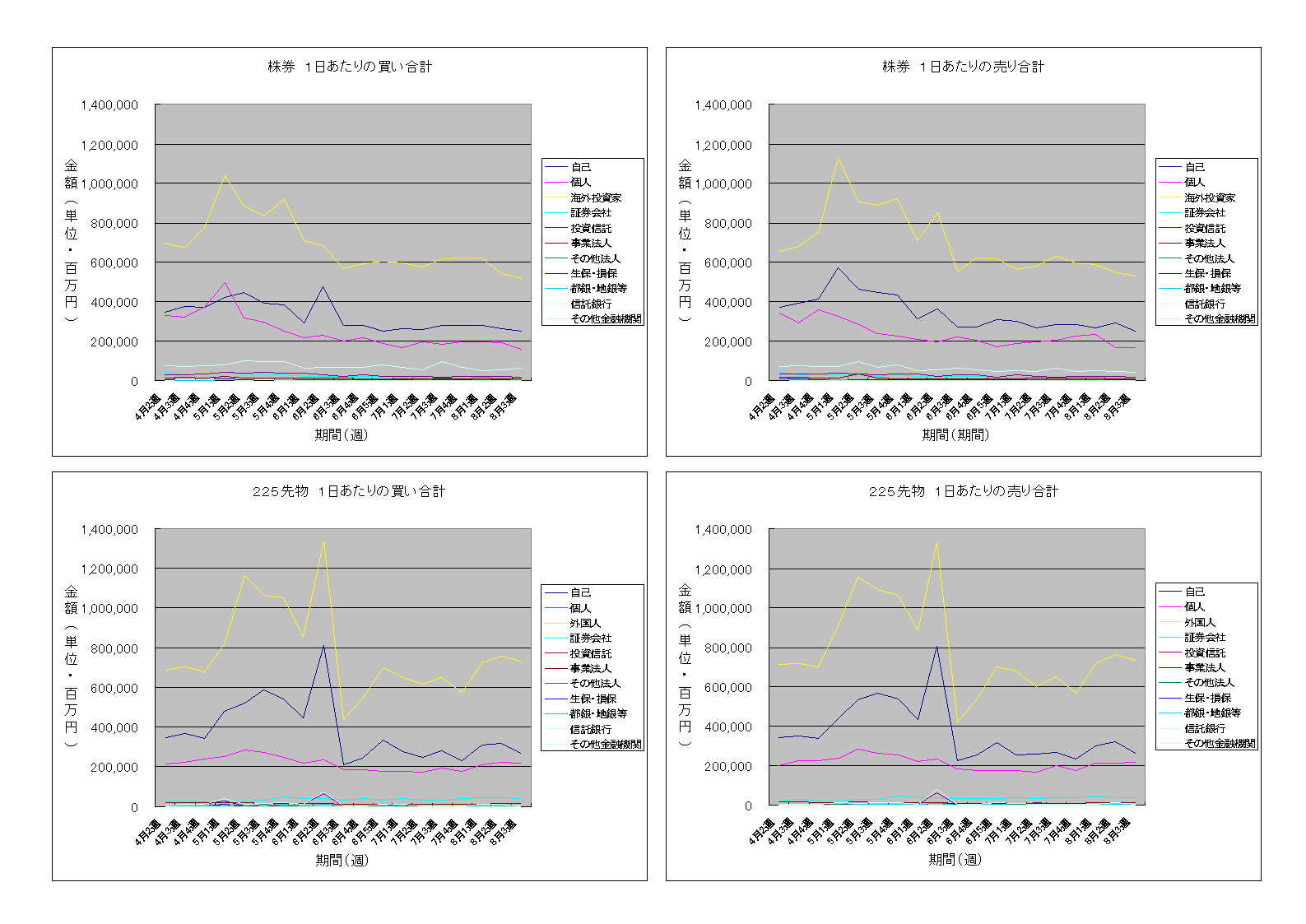 株券の売買金額がズルズルと減少し、先物の売買金額も少し減少してしまいました。株価水準を考えると失望を絵に描いたような状況といえるかもしれません。