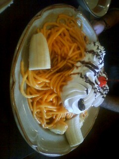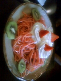 って言って食ったのがイチゴスパゲティ、バナナスパゲティ、イカスミジュース。