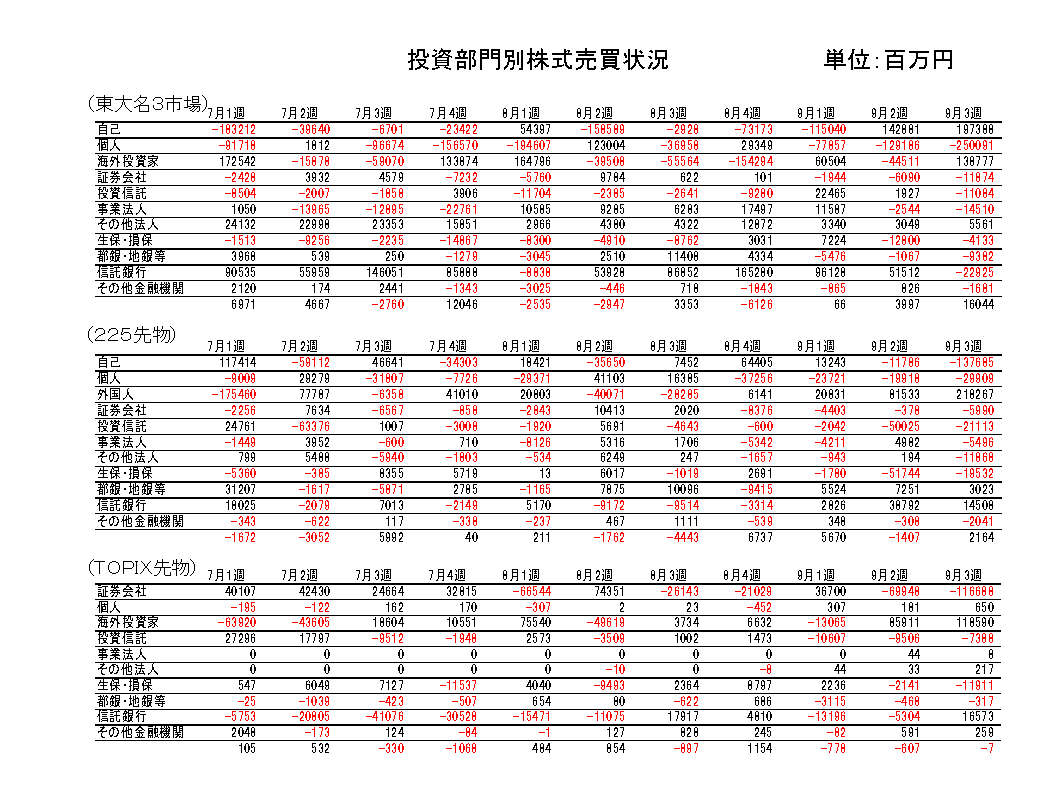株券については海外投資家とその他法人が買い越しで他は全て売り越しとなりました。その他法人の買い越しは未だ途切れることなく”不気味なほどに”続いています。