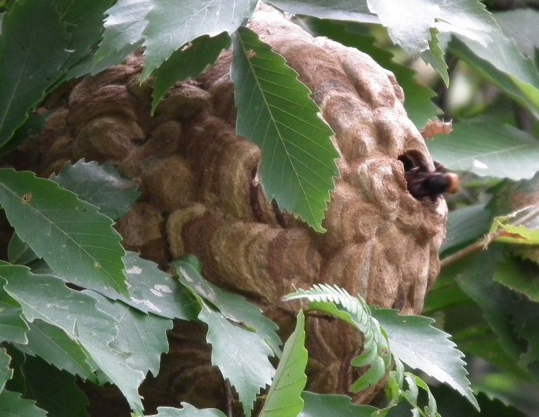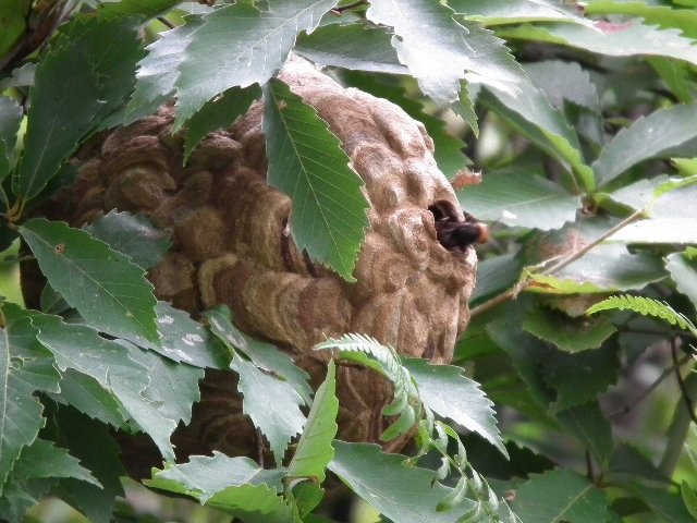 ひょいと顔をあげたら、なんと!スズメバチの丸い巣がありました