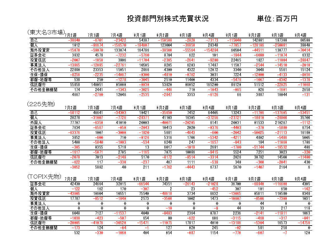 都銀・地銀等は売り越し継続。先物は225売り越し転換、TOPIX売り越し継続。