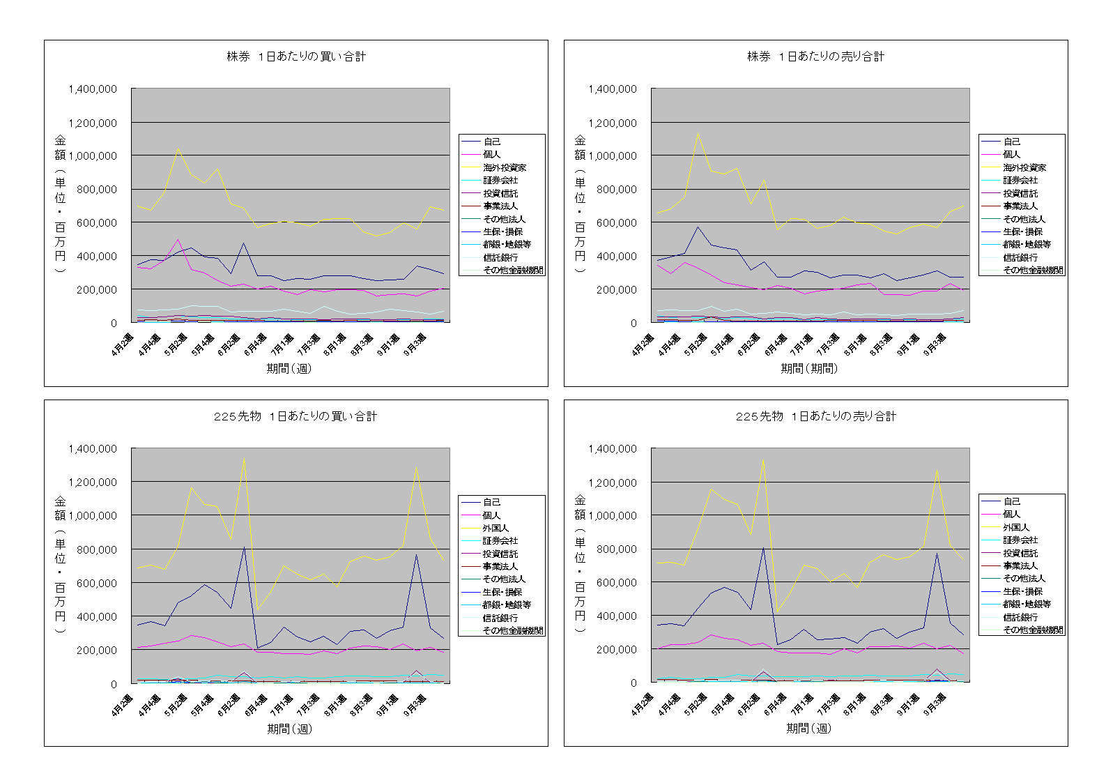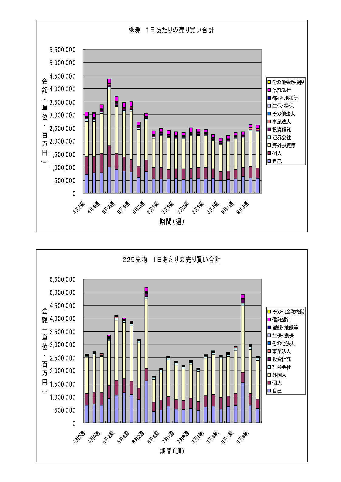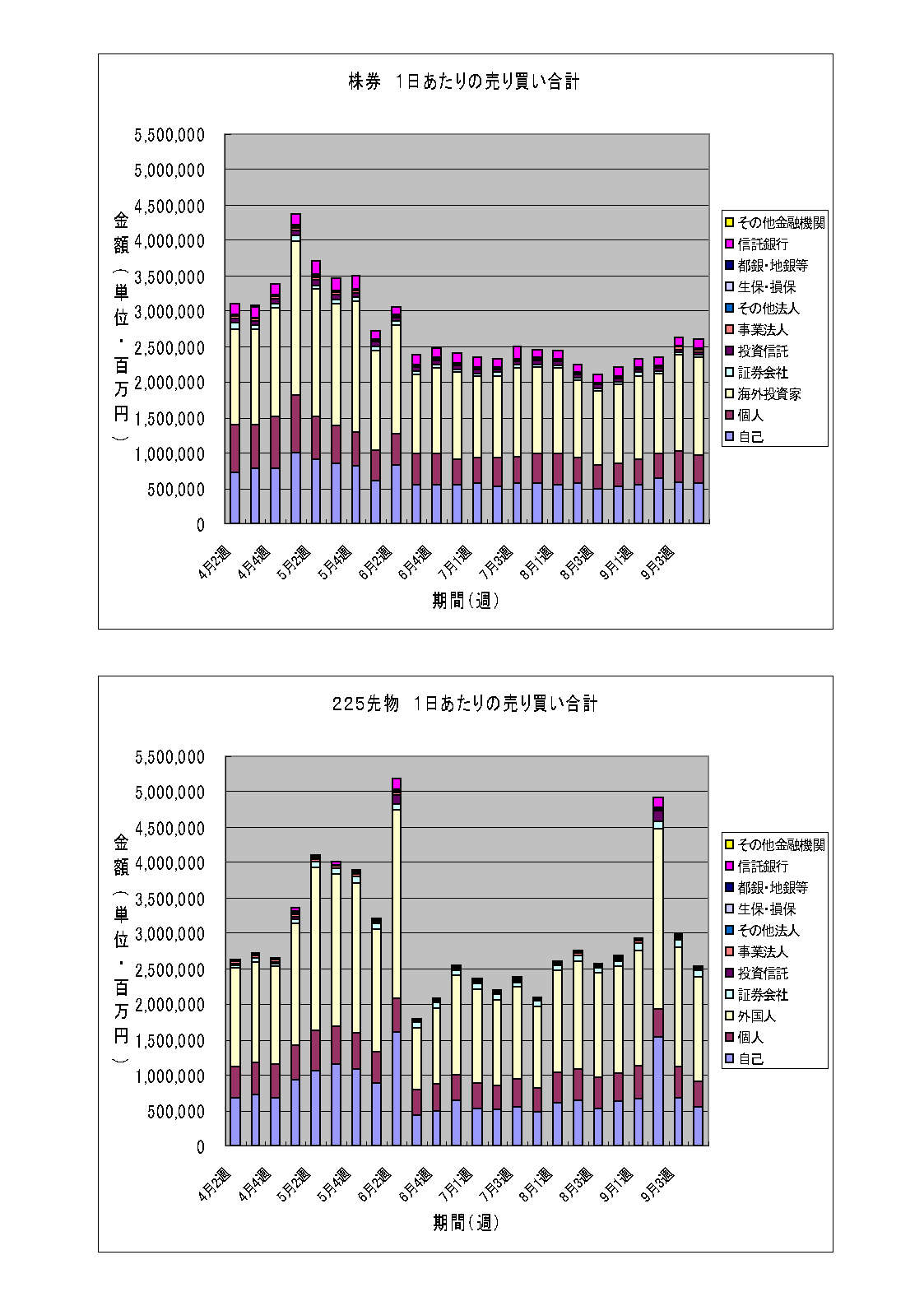 株券の売買金額の緩やかな増加が止まってしまいましたが、内容が良くないですね。海外投資家の売り合計は増加していますが買い合計は減少しています。日中問題があったし秋分の日を挟んだことも影響しているとは思いますが、一時的なものであって欲しいと思います。
