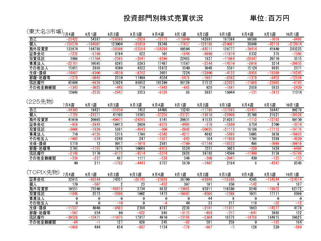 都銀・地銀等は売り越し継続。先物は225売り越し転換、TOPIX買い越し継続。