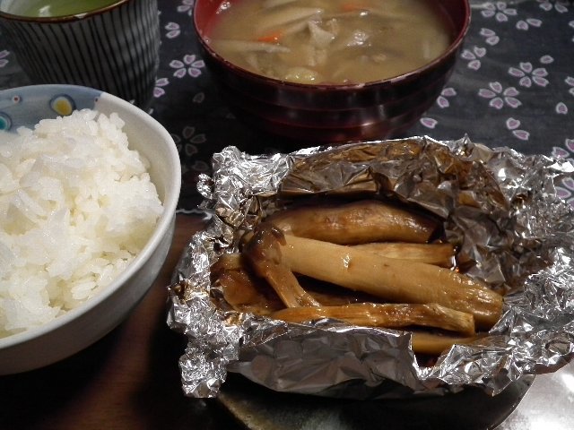 アルミホイルにブツ切りしたキノコを置き、ホイルを舟状にして醤油、みりんまたは酒をかけトースターでじっくり焼きます