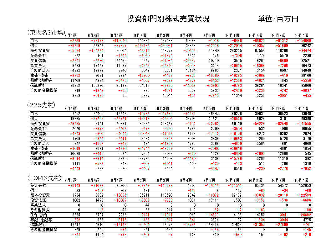 都銀・地銀等は売り越し転換。先物は225買い越し継続、TOPIX買い越し転換。