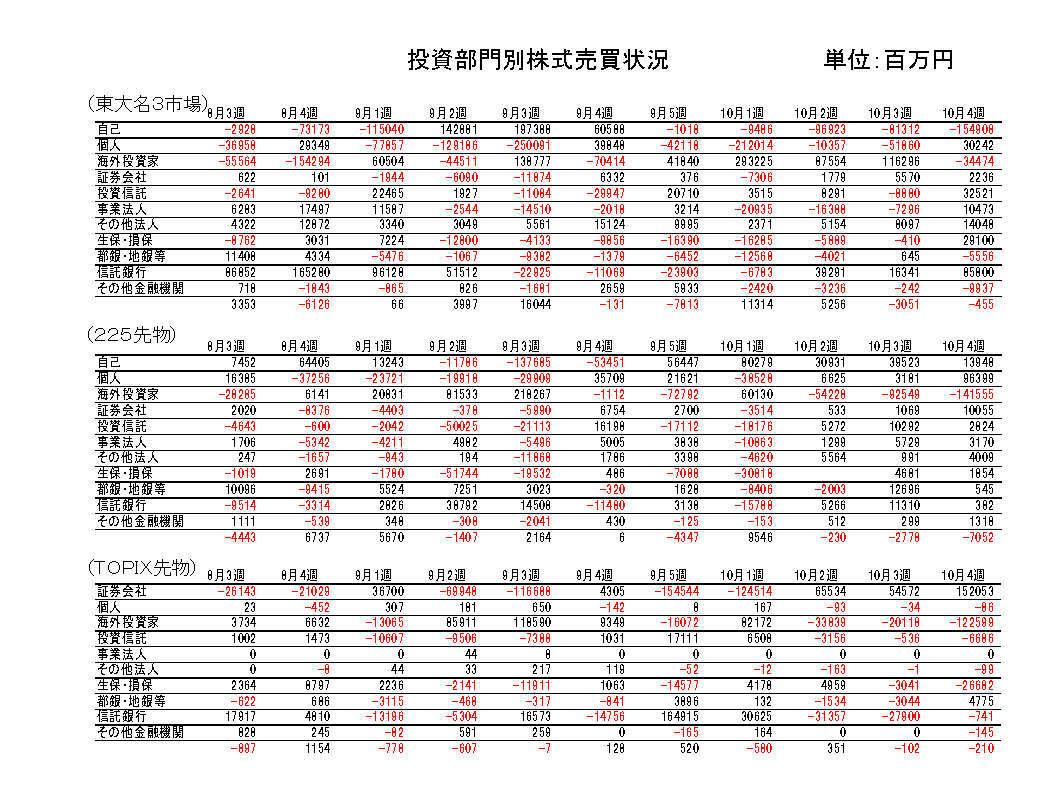 個人は買い越し転換。先物は225買い越し継続、TOPIX売り越し継続。