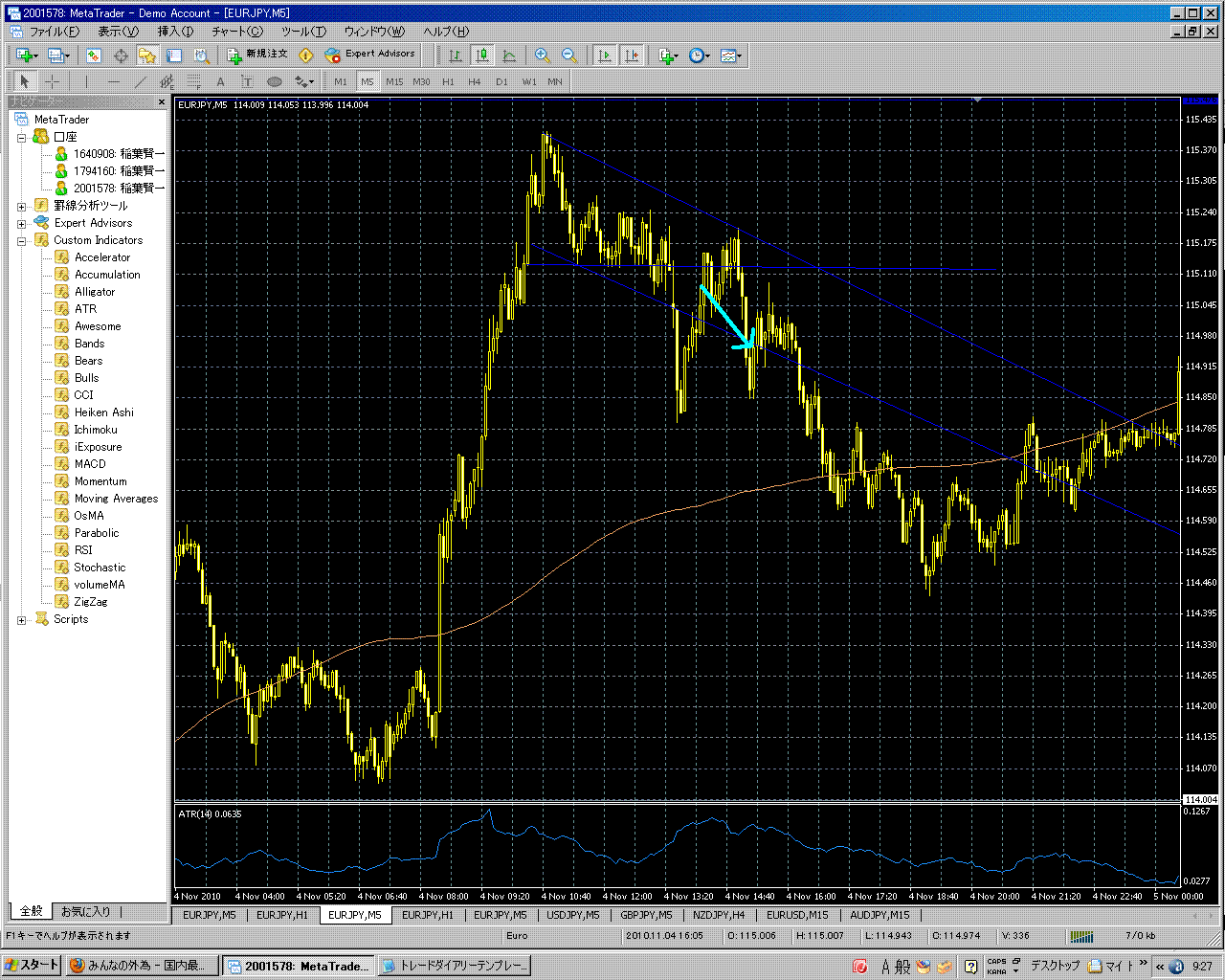 と見せかけて115.1に戻ってきたところでエントリーさらなる上昇を狙ったが、会えなくレジスタンスに引っかかり損切り。