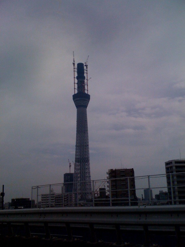 写真は昨日、写したスカイツリーです(曇っていて、少々見にくいです)。現在497メートル。完成はたしか634メートル(ムサシと覚えるのだそうです)だから、まだ130メートルも伸びる予定。竣工は2011年12月。あと1年も先です。