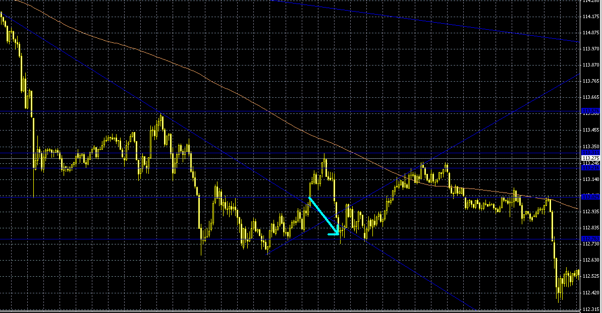 理由 : 112.71での反発後、チャートが2回トレンドライン上でボトムを確認。そのご長期チャートより引いたダウントレンドラインでのチャートの動きを1分足確認。このトレンドラインにおける反発を確認後、順張りで買いのトレード。