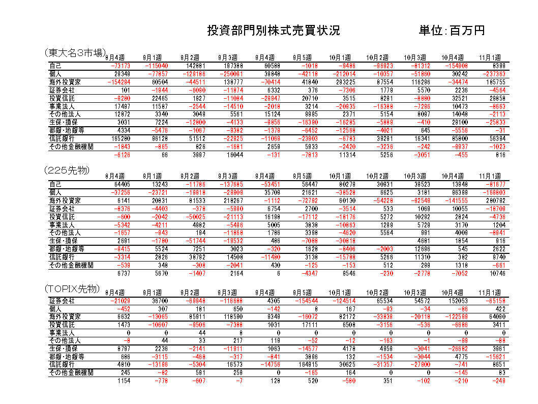 個人は売り越し転換。先物は225売り越し転換、TOPIX買い越し転換。