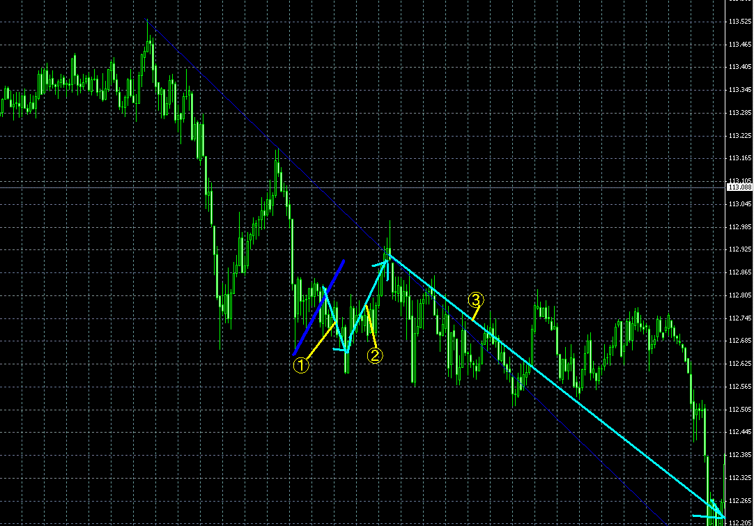 Title : 売りの流れのなかでの、買いの騙しを利用したトレード。トレンドライン+113.00のダブルゼロを組み合わせたトレード。