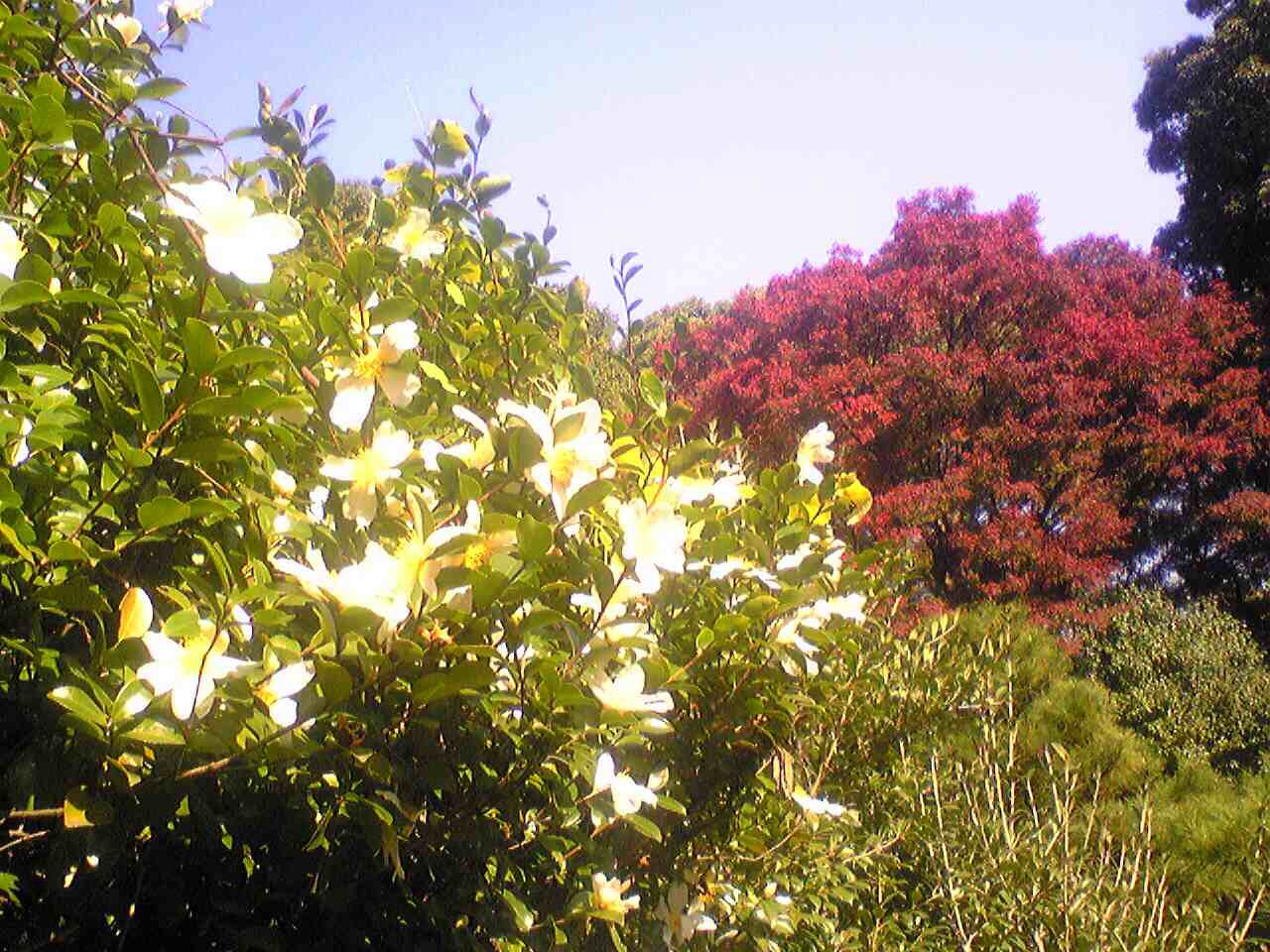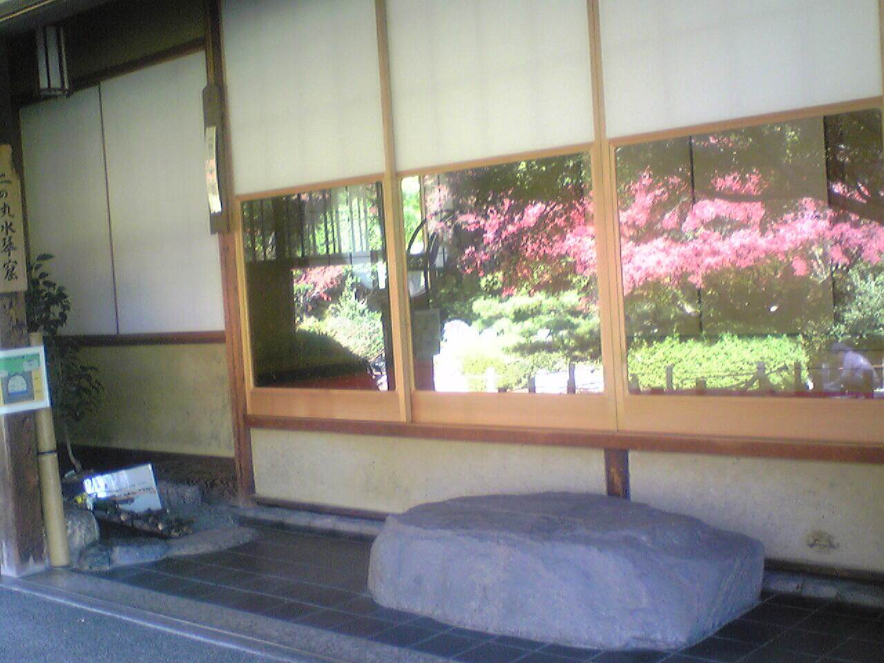 紅葉を見ながら金の茶釜のお茶をいただく。水琴窟のある庭のガラスに写る紅葉がきれいです。二の丸茶亭での風流な瞬間。3.二の丸茶亭前 サザンカ白