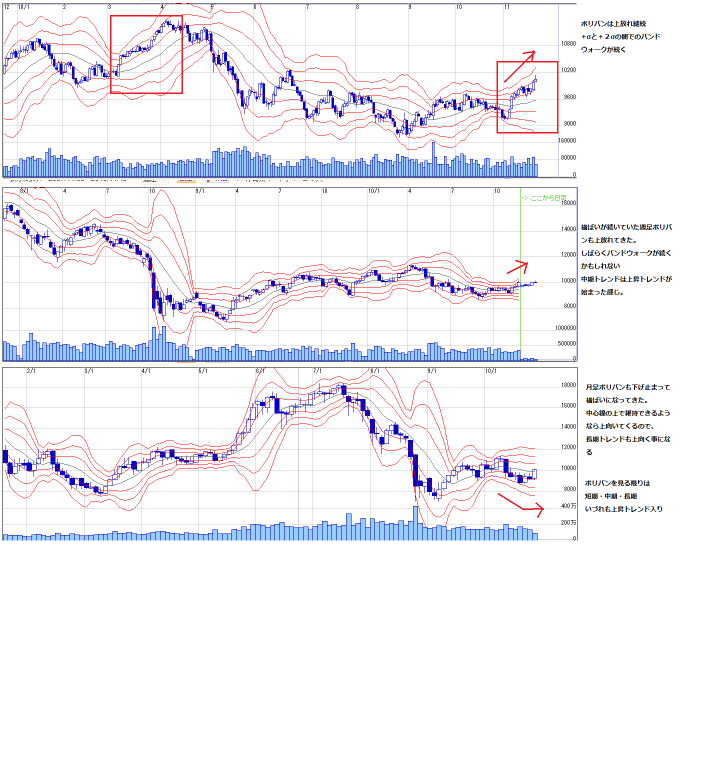 > ボリバンを見る限りは、短期・中期・長期いずれも上昇トレンド入り