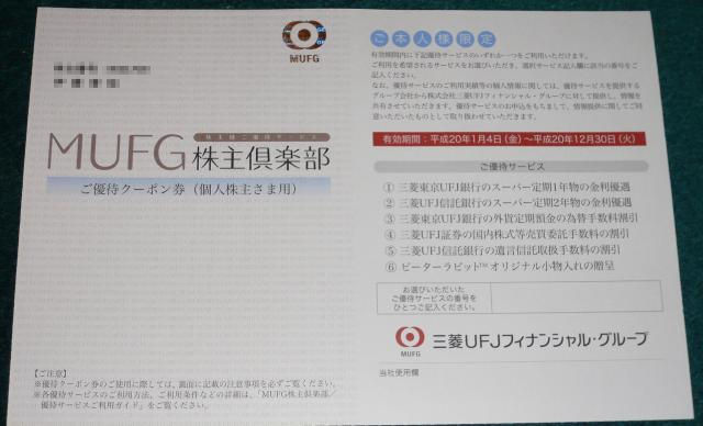 本日(8306)三菱UFJフィナンシャル・グループの株主優待が到着しました。