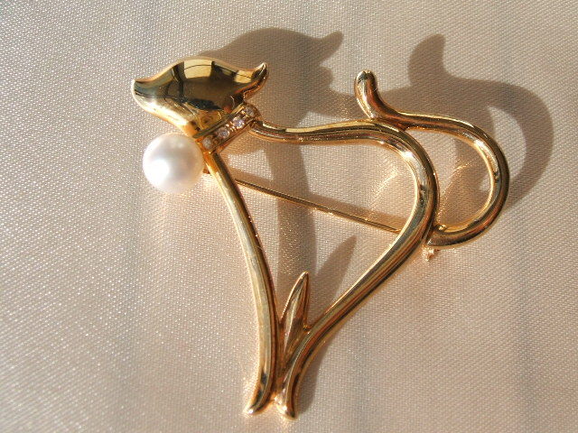 さて、今日の猫ちゃんは本真珠!の首輪をした、ブローチです。まだ、バブル真っ盛りの頃、ボーナスで購入いたしました。専業主婦になった今は、Tシャツやトレーナーばかりで着ける機会もありませんわ!
