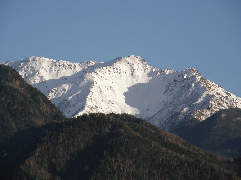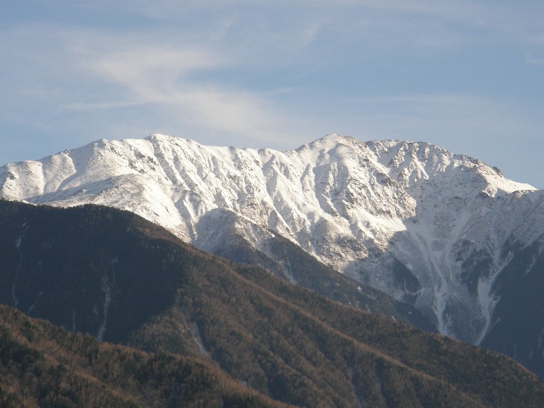 左が南アルプスの赤石岳、中が南アルプスの荒川前岳と中岳、右が中央アルプス、真中に位置するのが木曽駒