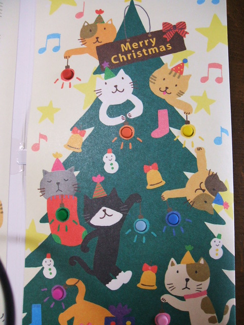 このクリスマスカード、開くと、「にゃん、にゃん」と言う声で、「諸人こぞりて、むかえまつれ。久しく待ちにし主はきませり(題は忘れてしまいました)」のメロディーを歌ってくれます。とってもチャーミングです。