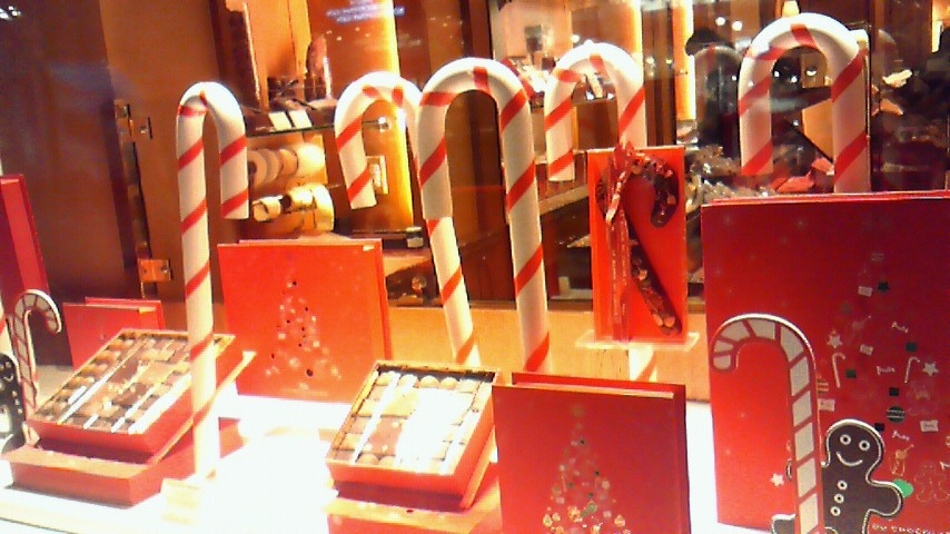 さて、写真は先日私の好きなチョコレート屋さんの前と、ケーキ屋さんの前でのクリスマスデコレーション。