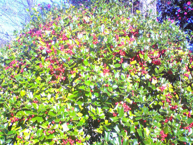 クリスマスケーキを食べるとヒイラギが飾ってあります。実際に大きな木になっているのを見るのはめったにありません。ヒイラギモチというのもあってよく間違えます。本物のヒイラギは黒い実になります。これは大きなヒイラギモチのようです。農業センターにて