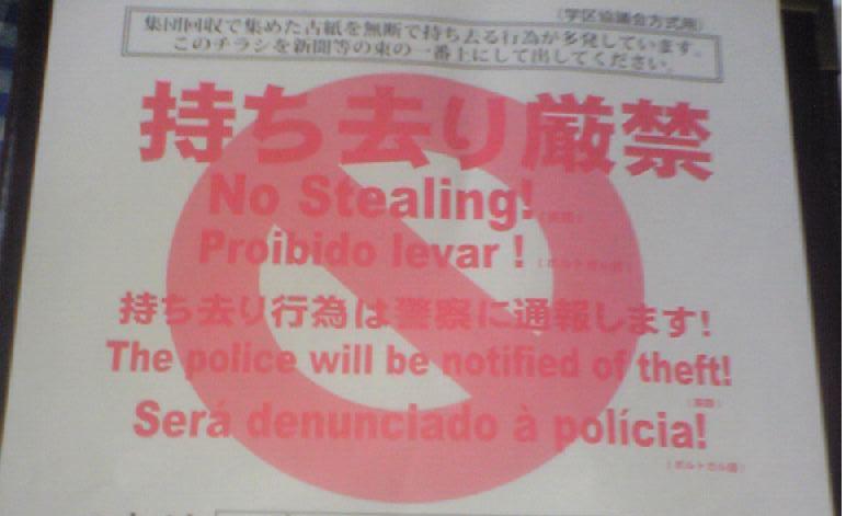 アルミ缶は分かるが、古新聞まで盗難に合うようだ、ポルトガル語、英語、などで書いてある。中国語も必要だろう。思わず情けない世の中だ。何とかしなくては。(Y)