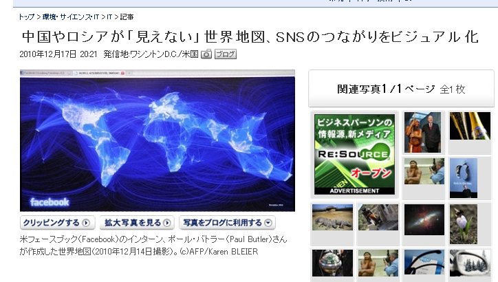米SNS大手フェースブック(Facebook)を利用する5億人のユーザーの親睦に、国境はどのような影響を与えているのか? こんな疑問を元に、フェースブックのインターン生が今週、ユーザーのつながりをビジュアル化した世界地図を作成した。