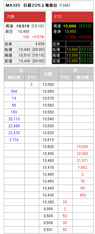 本日のカブコムPTSで、MAXIS 日経225上場投信 (1346) に誤発注がありました。